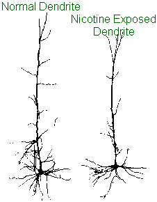 Human reports as well as animal studies have recorded accelerated motor activity, learning and memory deficits in offsprings of mothers exposed to nicotine during pregnancy. This study, conducted by Dr. T. S. Roy, Department of Anatomy, All India Institute of Medical Sciences, New Delhi, India, is the first to investigate actual physiological changes of the cerebral cortex of rats after prenatal nicotine exposure. Several groups of experimental rats were exposed to varying levels of nicotine reaching up to that experienced by a heavy smoker. Animals were examined at different periods after birth. Observable effects included significantly reduced thickness of the cerebral cortex, smaller cerebral cortex neurons, and reduced brain weight. Also noted was an overall decrease in “dendritic branching” (connections to other brain cells), as seen in the camera lucida drawings at right. The present study also shows that the greater the dose of nicotine, the greater the biological effects upon the offspring. This research provides an excellent biological model to support the many other studies linking increased hyperactivity, attention deficits, lower IQ, and learning disabilities in children with parents who smoked during pregnancy.